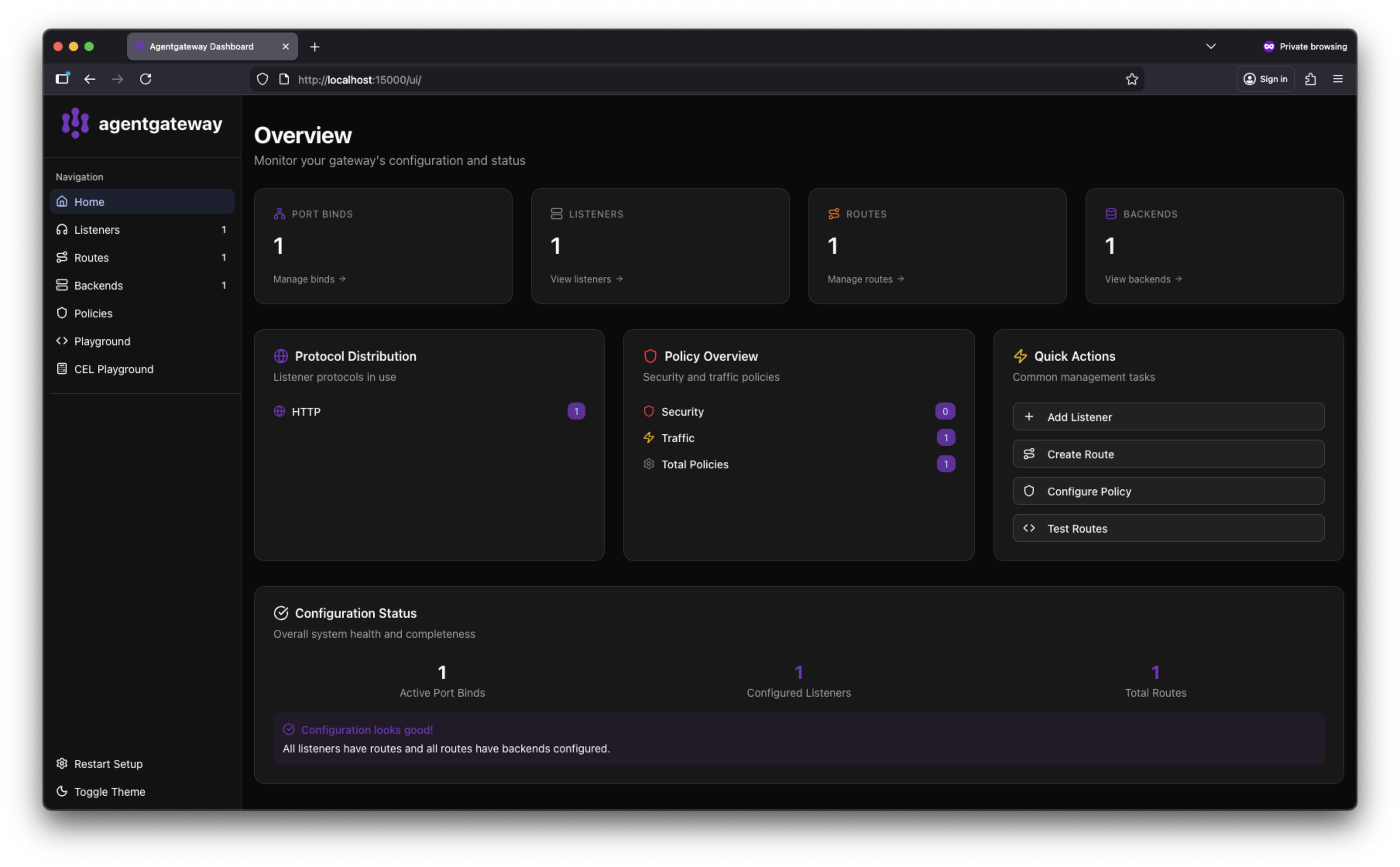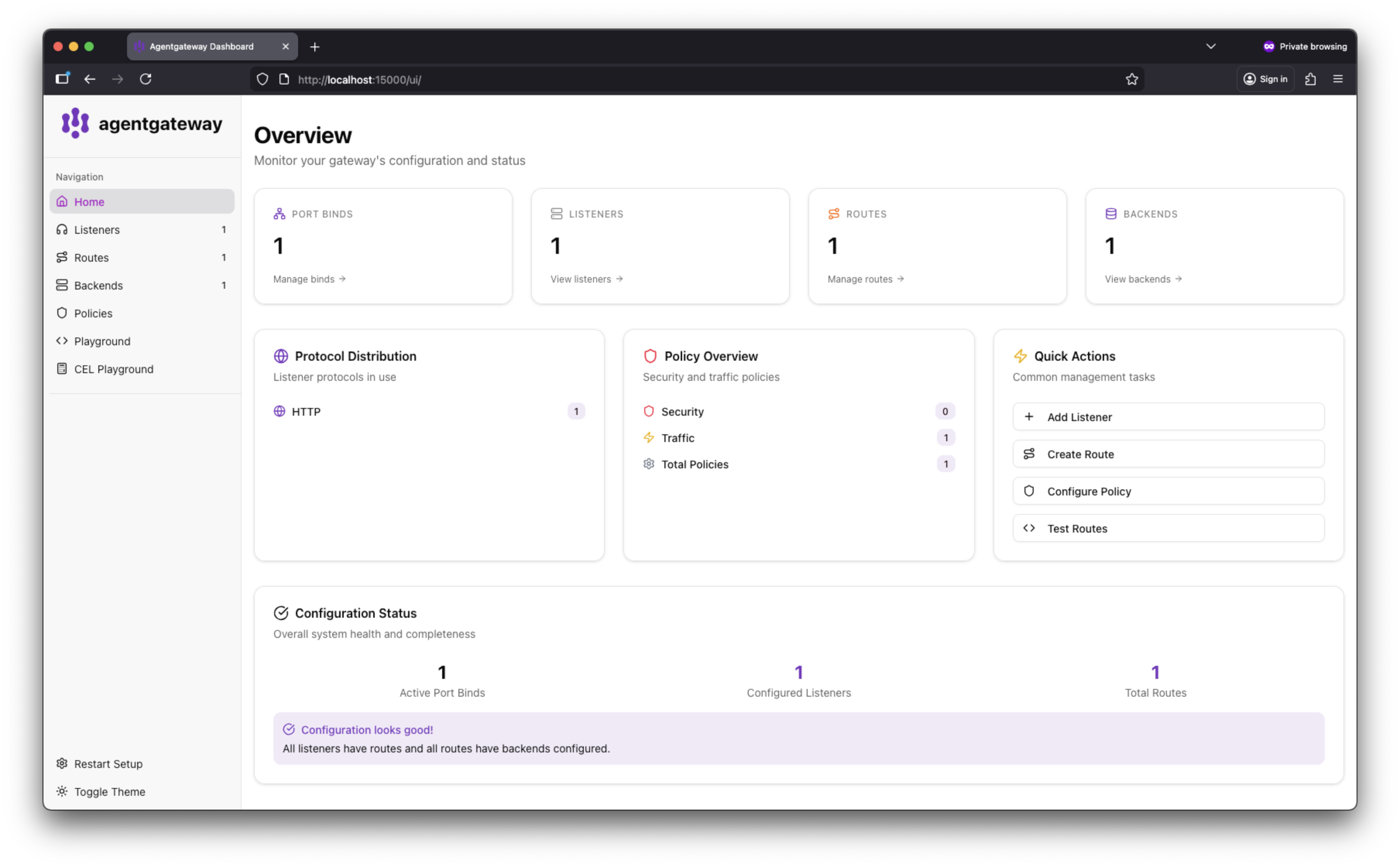 The agentgateway Admin UI is a built-in web interface that runs alongside the proxy on port 15000 by default. In standalone mode, the UI is fully interactive — you can inspect your current configuration and manage your proxy without restarting agentgateway.