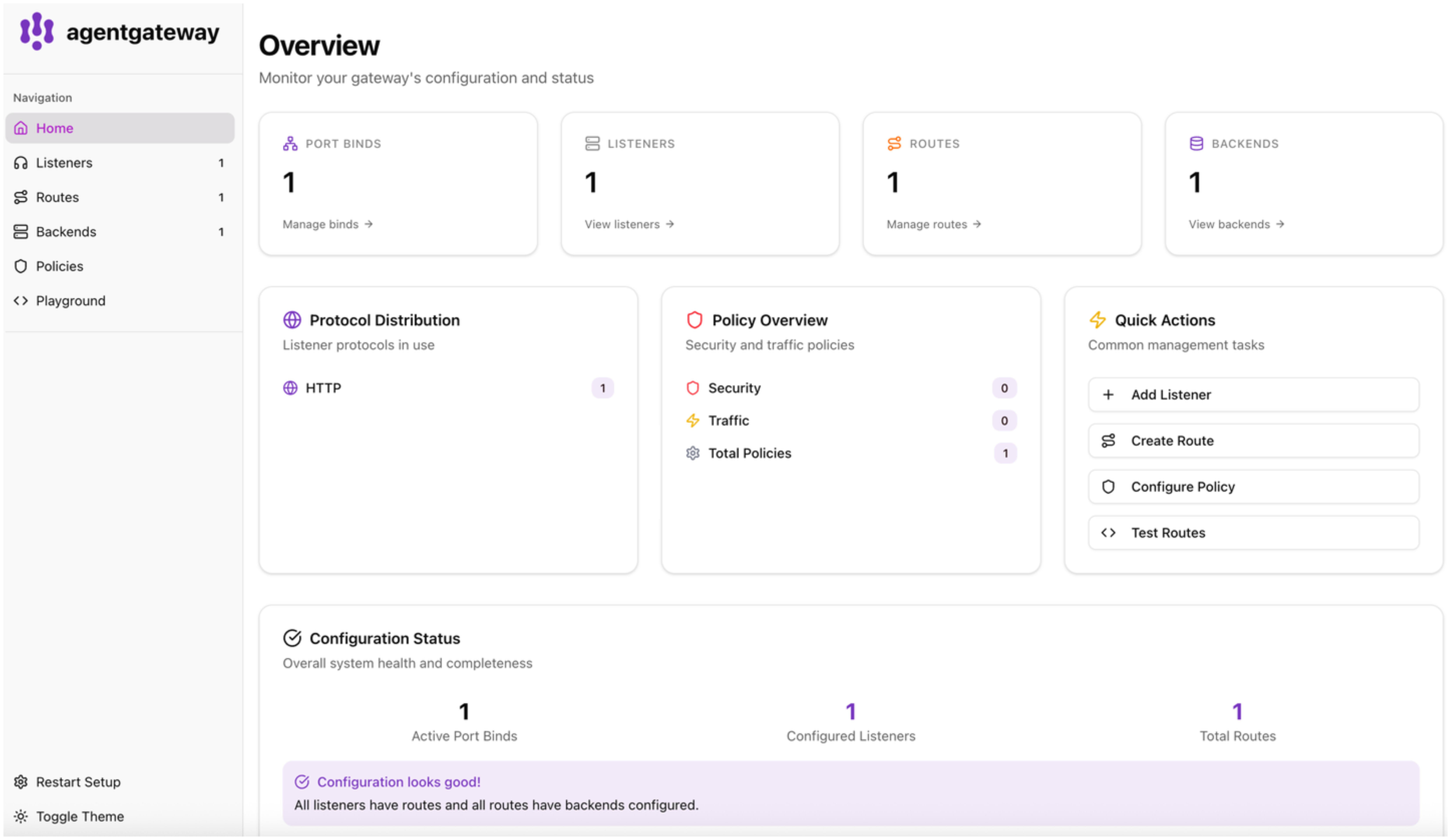 You can change listener, route, and backend configuration in the UI. Any updates you make apply immediately without restarting agentgateway.