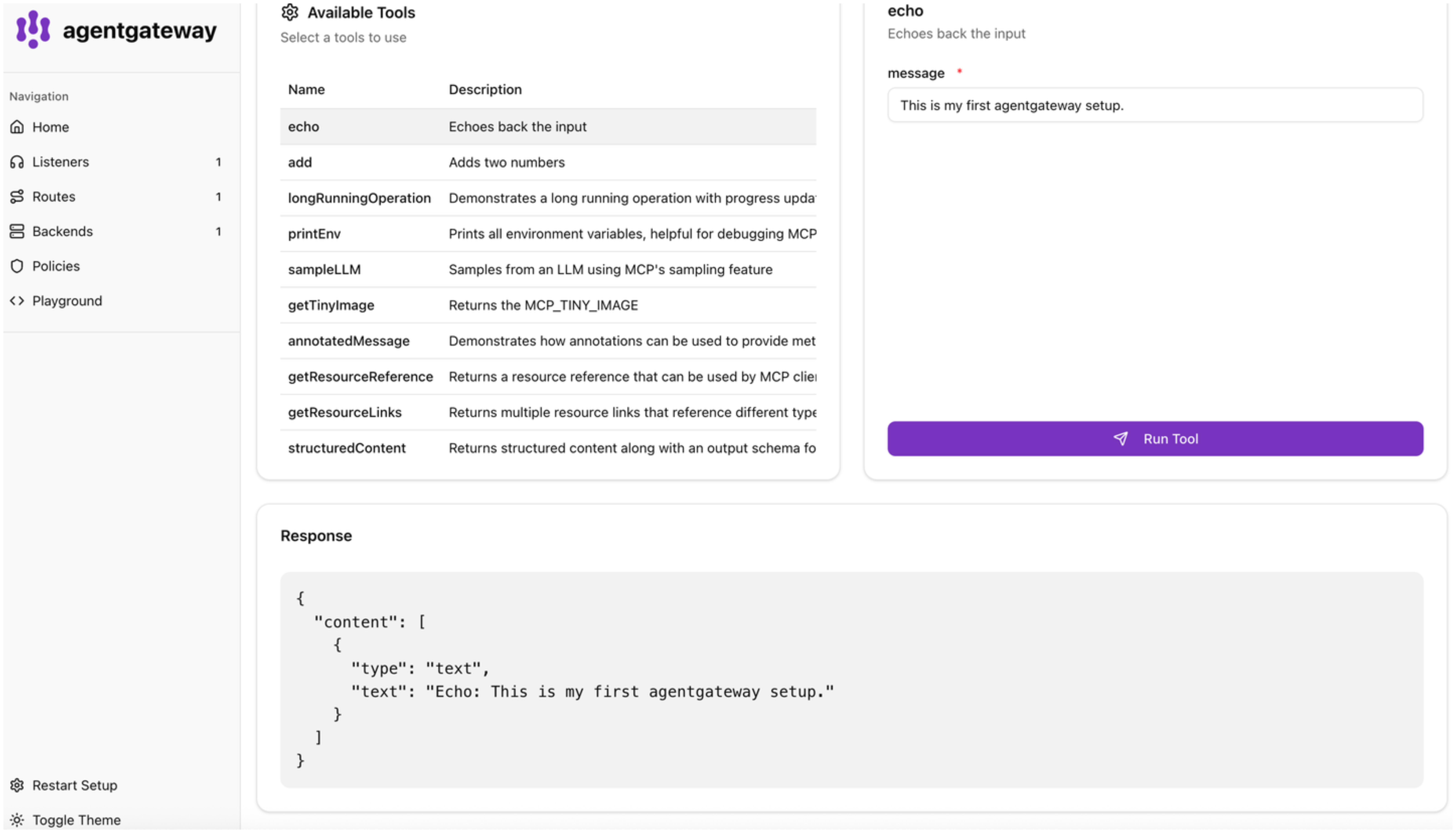 Use the agentgateway binary to proxy requests to an open source MCP test server, server-everything. Then, try a tool in the built-in agentgateway playground.